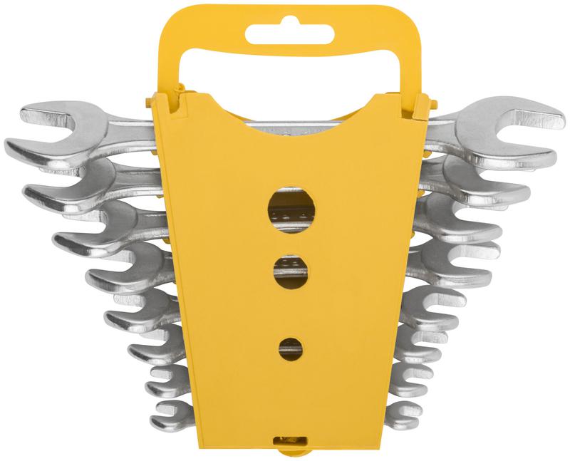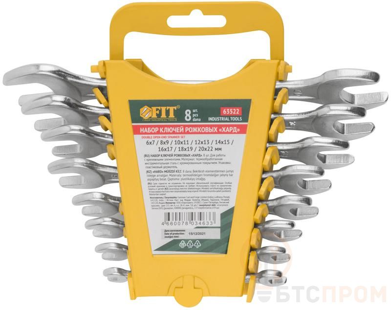 Ключи рожковые ‘’Хард’’ FIT IT предназначены для работ с крепежными элементами. Ключи проходят процесс закалки, повышающей твердость и износостойкость ключей. Наклон рабочих частей в 15° повышает эффективность работы. Рожковая часть ключа эффективна при работе в труднодоступных местах. Эргономичная форма ключей обеспечивает надежный хват. Хромированное покрытие предотвращает коррозию. Пластиковый держатель позволяет организованно хранить ключи.