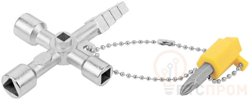 5-в-1. Для открытия электрических и сантехнических шкафов, в коммуникациях зданий и транспорта, а также в системах рециркуляции воздуха. Квадрат 5, 7, 8 мм, треугольник 9 мм, внешний квадрат 6, 7, 8, 9 мм. В комплекте двусторонняя бита PH2/SL7 с держателем. Материал: цинковый корпус с никелевым покрытием, бита из хром-ванадиевой стали, пластиковый держатель. Упаковка: блистер.