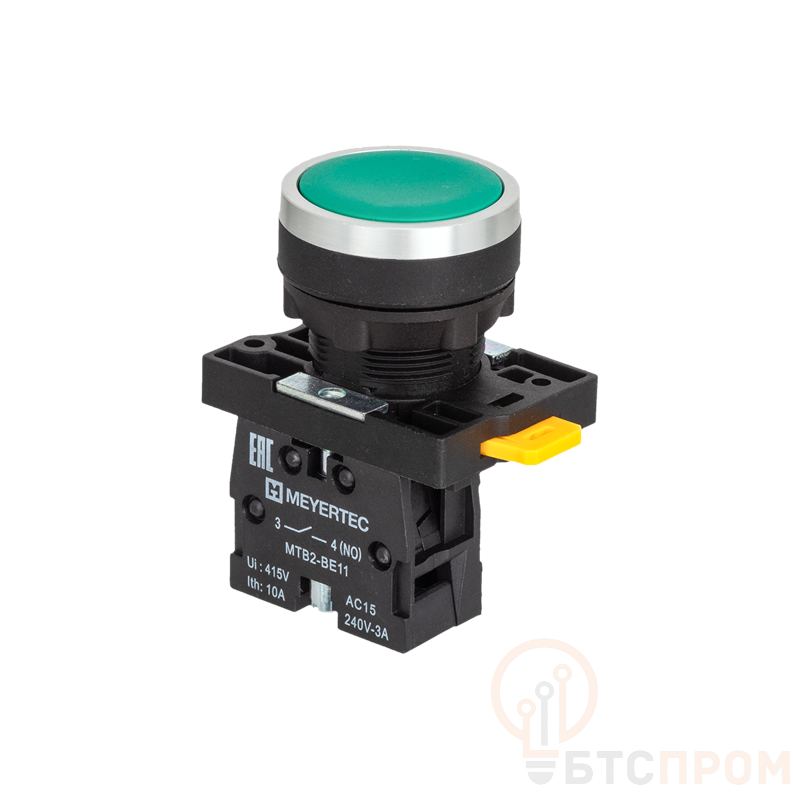 Корпус изделия выполнен из прочного пластика, окрашен в зеленый цвет для визуальной идентификации функций. Контактная группа — 1 нормально разомкнутый контакт (1NO). Кнопка предназначена для монтажа на стандартную монтажную панель или дверь шкафа управления.