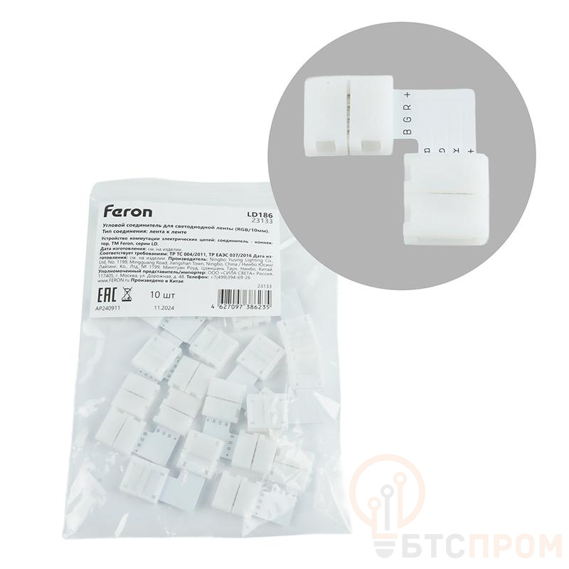 Комплект L коннекторов с соединителем для светодиодной ленты RGB (10мм), LD186 FERON