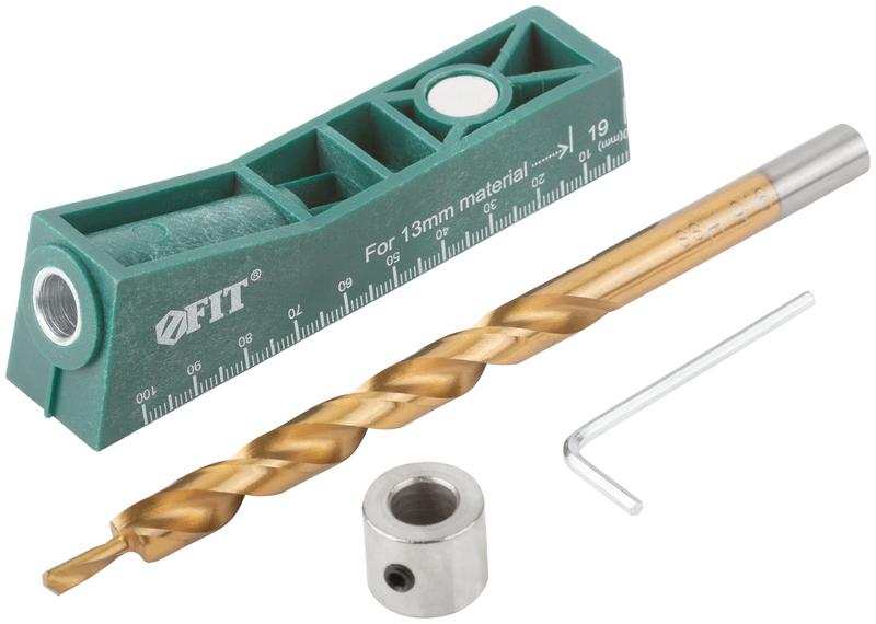 Кондуктор для глухих отверстий одинарный FIT IT предназначен для точного позиционирования сверла при сверлении глухих отверстий под углом 15°, с помощью которых можно соединять две деревянные заготовки. Оптимально для заготовок толщиной 14–38 мм. Корпус кондуктора изготовлен из прочного нейлона. Внутренняя стальная направляющая обладает высокой износостойкостью. Встроенный ферритовый магнит помогает надежнее фиксировать стальной зажим. Вырез в корпусе обеспечивает отвод стружки. Линейка способствует точному позиционированию кондуктора. Наконечник сверла со спиральным профилем оптимален для сверления отверстий под косой шуруп. Сверло изготовлено из быстрорежущей стали и обладает высокой прочностью и износостойкостью. Покрытие из нитрида титана (TiN) снижает сопротивление во время сверления и повышает поверхностную твердость сверла. Ограничитель помогает сверлить отверстия с заданной глубиной.