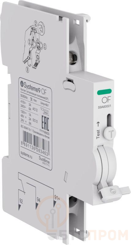 Контакт сигнализации состояния контактной группы устройства (OF) S9. Присоединяется к автоматическим выключателям, автоматическим дифференциальным выключателям, выключателям дифференциального тока, блокам дифференциального тока (монтаж на АВ) и выключателям нагрузки серии Systeme9, для реализации функции сигнализации положения («включено - отключено») этих аппаратов. Они устанавливаются защёлкиванием (без использования инструмента) слева от соответствующего аппарата. Ширина устройства - 9мм. Дополнительные контакты монтируются на устройство после расцепителей, если таковые присутствуют. Максимальное количество дополнительных контактов для одного устройства - 3 штуки, если не установлены расцепители. Если расцепители установлены, то не более 2 штук.