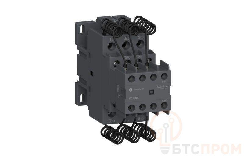 Контактор серии SystemePact MC1D для конденсаторных батарей, номинальная мощность – 10 кВАр, 3P, 1НО+2НЗ, напряжение управления – 380 В пер.тока, категория применения – AC-6b, монтаж – на DIN-рейке или на монтажной плате с помощью винтовых зажимов. Контакторы серии SystemePact M MC1DE…WK предназначены для коммутации трехфазных одно- и многоступенчатых конденсаторных батарей, оснащены блоком контактов предварительного срабатывания и гасящих резисторов, ограничивающих величину тока до 60In.