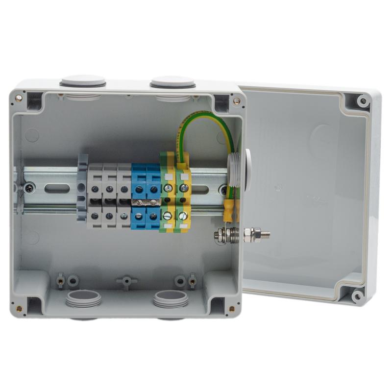 Распределительная коробка используется для обеспечения высокой степени защиты IP в местах соединения проводов. Корпус изготовлен из ударопрочного поликорбаната с УФ защитой, не поддерживающего горение.