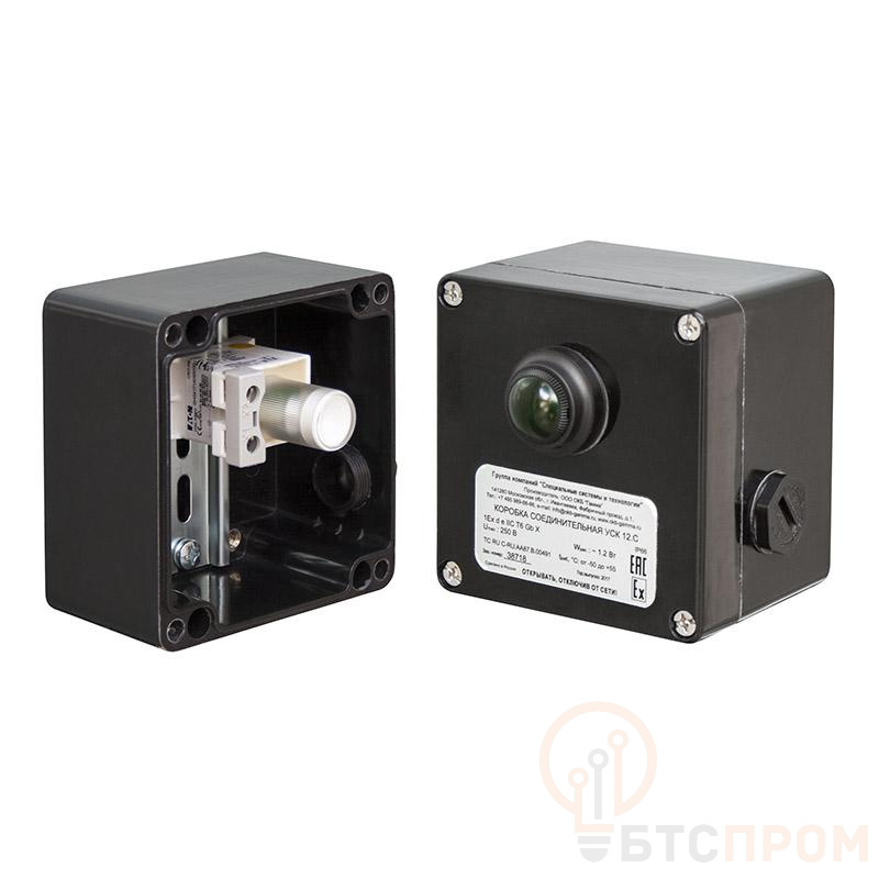 Коробка соединительная УСК 12.С предназначена для индикации напряжения на нагревательной секции на базе саморегулирующихся электрических нагревательных лент. Коробка крепится при помощи кронштейна непосредственно на трубопроводе или близлежащей металлоконструкции, стене здания. Световая лампа со сверхярким диодом сигнализирует о наличии напряжения в конце нагревательной секции. Светодиод зеленого цвета имеет длительный срок службы и виден с любого угла, в том числе при прямом попадании солнечных лучей. Коробка позволяет выполнить подключение одной саморегулирующейся электрической нагревательной ленты. Конструкция корпуса обеспечивает защиту от проникновения влаги и пыли IP66 и высокую коррозионную стойкость. Применяемые клеммные наборы позволяют обеспечить подключение многожильных или одножильных проводов сечением до 2,5 мм?. Гарантия на коробку УСК 12.С составляет 1 год с момента продажи. Тип клеммных зажимов - винтовой. Преимущества коробки УСК 12.С: Удобство и простота монтажа; Обеспечивает световую сигнализацию о наличии питания в конце нагревательной секции; Высокая термостойкость и механическая прочность; Коробка не подвергается коррозии; Применяется для всех типов саморегулирующихся электрических нагревательных кабелей; Исключает риск повреждения нагревательных кабелей в местах заделки; Имеет сертификат соответствия ГОСТ Р для применения во взрывоопасных зонах.