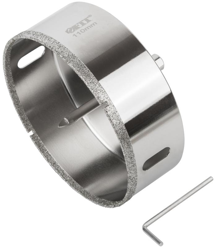 Трехгранный хвостовик. Идут в комплекте с центрирующим сверлом и шестигранным ключом. Для вырезания круговых отверстий в керамограните, камне, стекле, кафельной плитке. Влажное сверление. Глубина пропила 40 мм. Материал: инструментальная сталь, режущая кромка содержит порошок из технических алмазов. Упаковка: блистер.