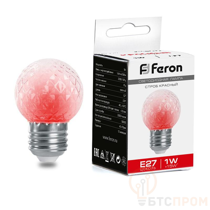 Лампа светодиодная FERON LB-377, G45 (шар), 1W 230V E27 (красный), рассеиватель прозрачный белый, угол рассеивания 270°, 70*45мм