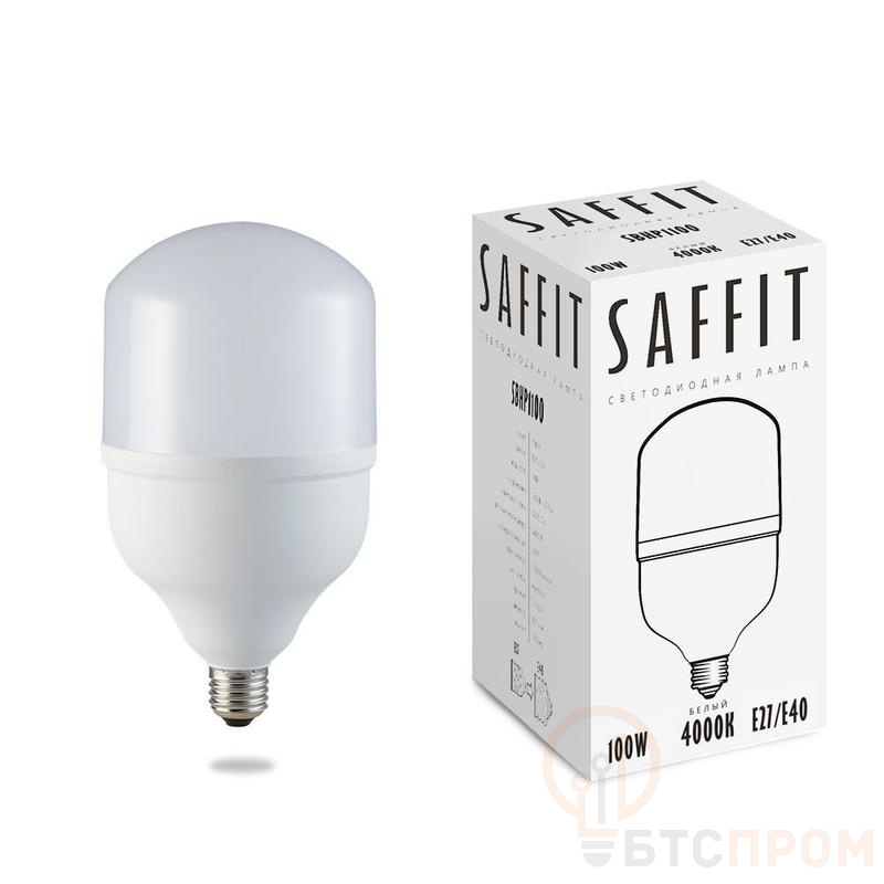 Лампа светодиодная SAFFIT SBHP1100, колба (промышленная), 100W 230V E27-E40 6400К (дневной), рассеиватель матовый белый, 9100Lm, угол рассеивания 220°, 255*160мм