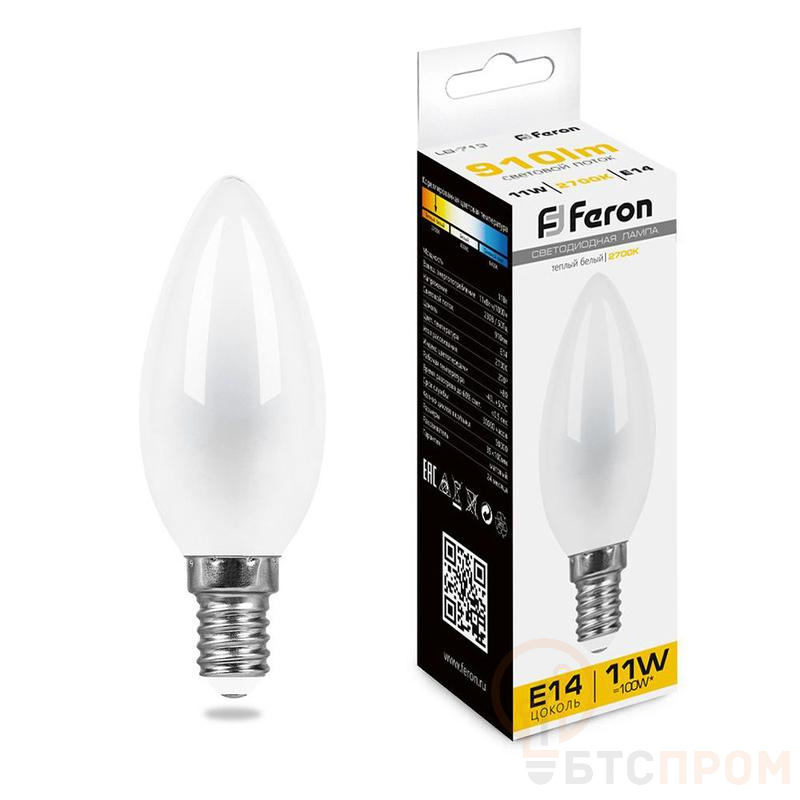 Лампа светодиодная филамент FERON LB-713, C35 (свеча), 11W 230V E14 2700К (белый теплый), рассеиватель матовый белый, 910Lm, угол рассеивания 270°, 100*35мм