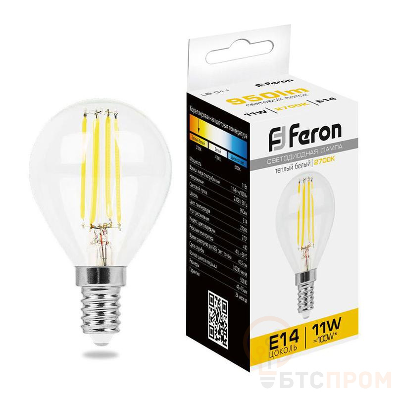 Лампа светодиодная филамент FERON LB-511, G45 (шар малый), 11W 230V E14 2700К (белый теплый), рассеиватель прозрачный 950Lm, угол рассеивания 270°, 75*45мм