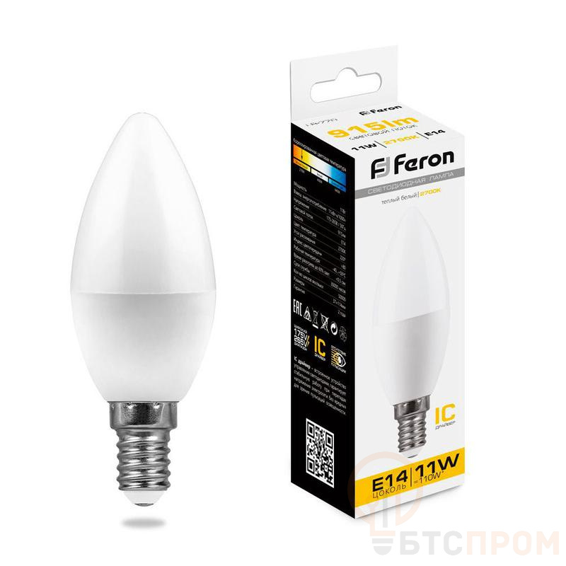 Лампа светодиодная FERON LB-770, C37 (свеча), 11W 175-265V E14 2700К (белый теплый), рассеиватель матовый белый, 915Lm, угол рассеивания 220°, 110*37мм
