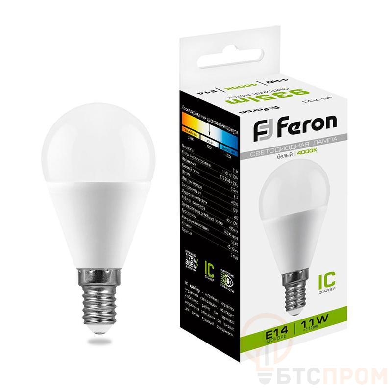 Лампа светодиодная FERON LB-750, G45 (шар малый), 11W 175-265V E14 4000К (белый), рассеиватель матовый белый, 935Lm, угол рассеивания 220°, 90*45мм