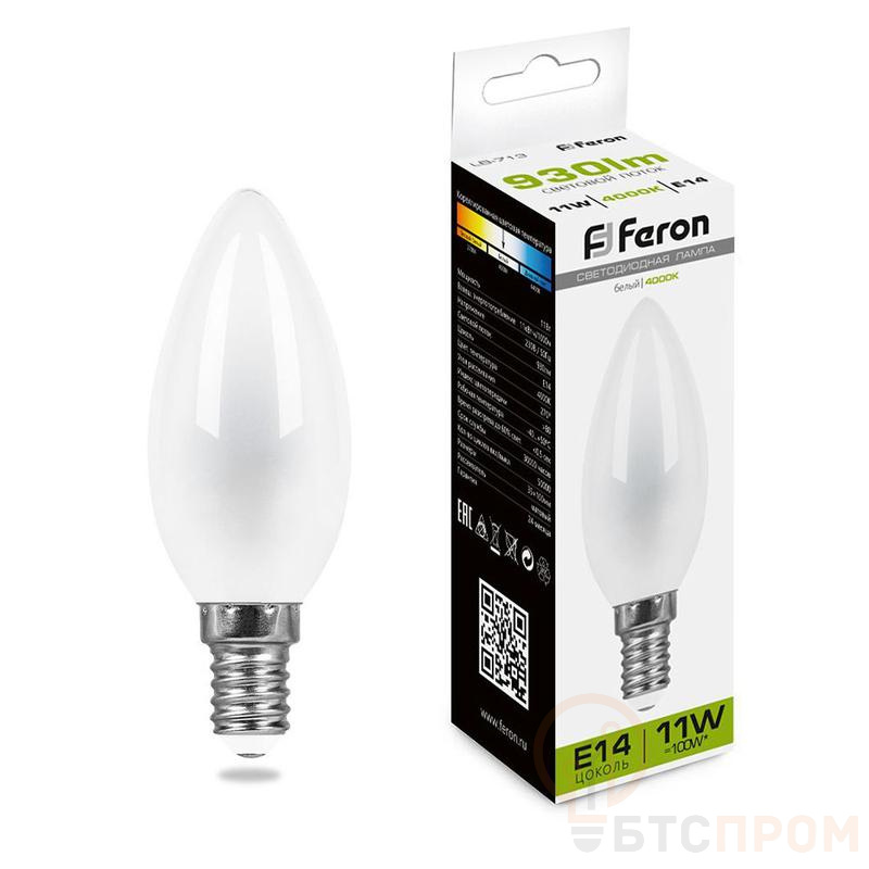 Лампа светодиодная филамент FERON LB-713 , C35 (свеча), 11W 230V E14 4000К (белый), рассеиватель матовый белый, 930Lm, угол рассеивания 270°, 100*35мм