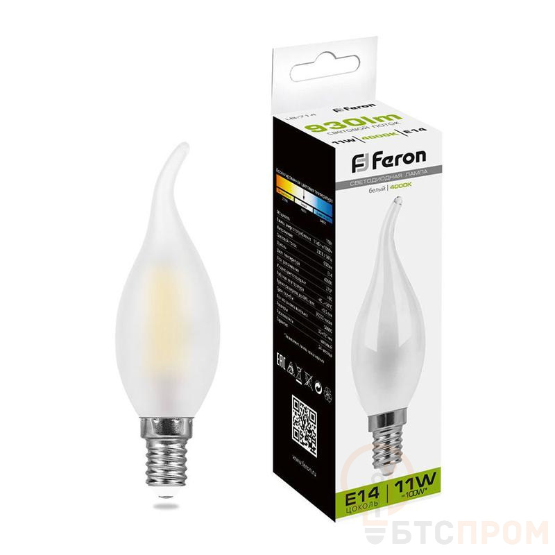 Лампа светодиодная филамент FERON LB-714, C35T (свеча на ветру), 11W 230V E14 4000К (белый), рассеиватель матовый белый, 930Lm, угол рассеивания 270°, 121*35мм