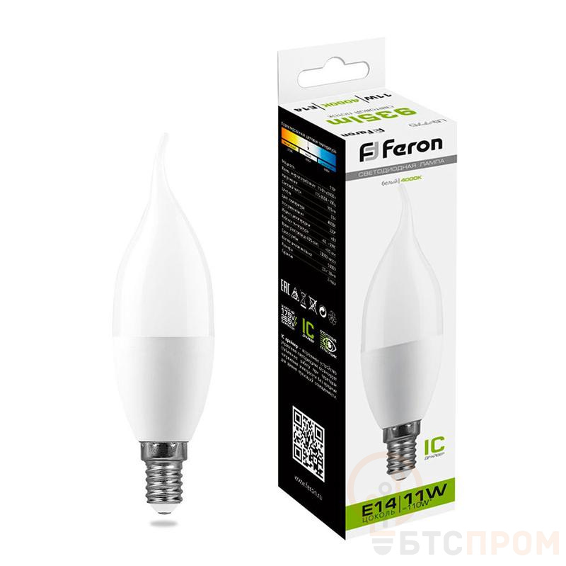 Лампа светодиодная FERON LB-770, C37T (свеча на ветру), 11W 175-265V E14 4000К (белый), рассеиватель матовый белый, 935Lm, угол рассеивания 220°, 135*37мм
