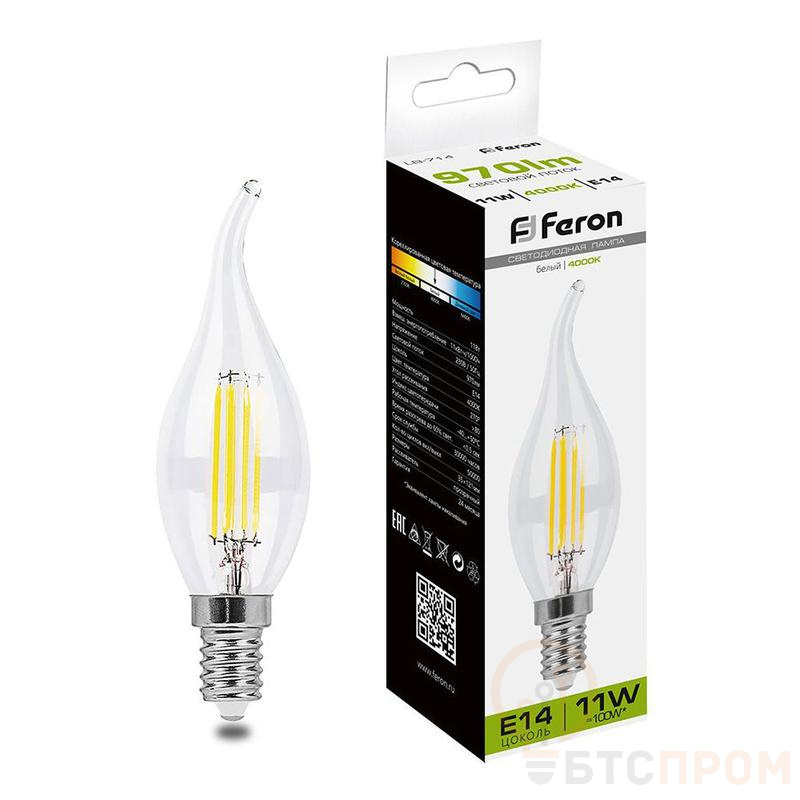 Лампа светодиодная филамент FERON LB-714, C35T (свеча на ветру), 11W 230V E14 4000К (белый), рассеиватель прозрачный 970Lm, угол рассеивания 270°, 121*35мм