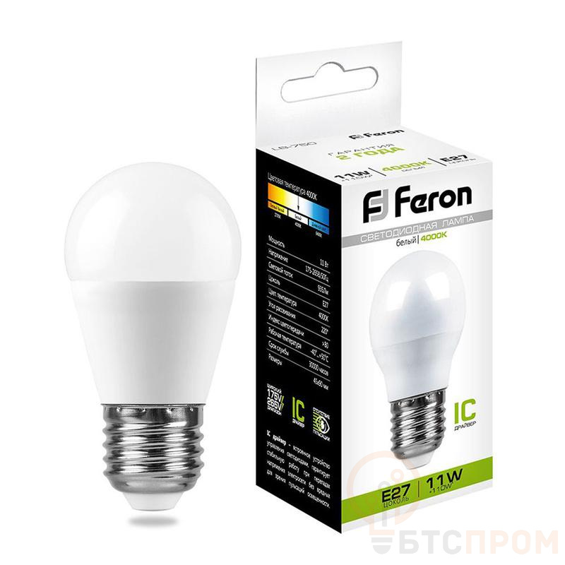 Лампа светодиодная FERON LB-750, G45 (шар малый), 11W 175-265V E27 4000К (белый), рассеиватель матовый белый, 935Lm, угол рассеивания 220°, 90*45мм
