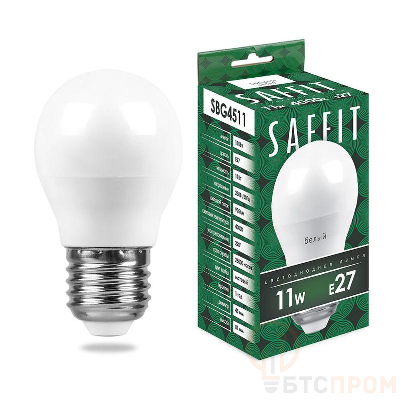 Лампа светодиодная SAFFIT SBG4511, G45 (шар), 11W 230V E27 4000К (белый), рассеиватель матовый белый, 905Lm, угол рассеивания 220°, 80*45мм