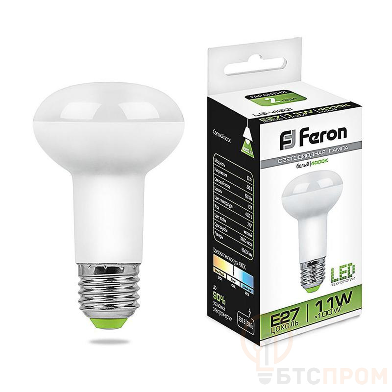 Лампа светодиодная FERON LB-463, R63 (рефлекторная), 11W 175-265V E27 4000К (белый), рассеиватель матовый белый, 880Lm, угол рассеивания 120°, 99*63мм
