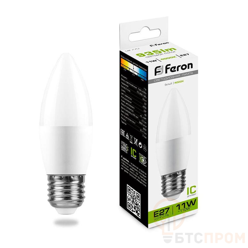 Лампа светодиодная FERON LB-770, C37 (свеча), 11W 175-265V E27 4000К (белый), рассеиватель матовый белый, 935Lm, угол рассеивания 220°, корпус пластик, 107*37мм