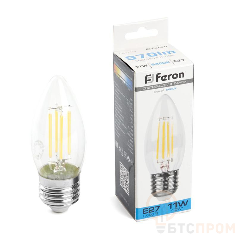 Лампа светодиодная филамент FERON LB-713, C35 (свеча), 11W 230V E27 6400К (дневной), рассеиватель прозрачный 990Lm, угол рассеивания 270°, 100*35мм