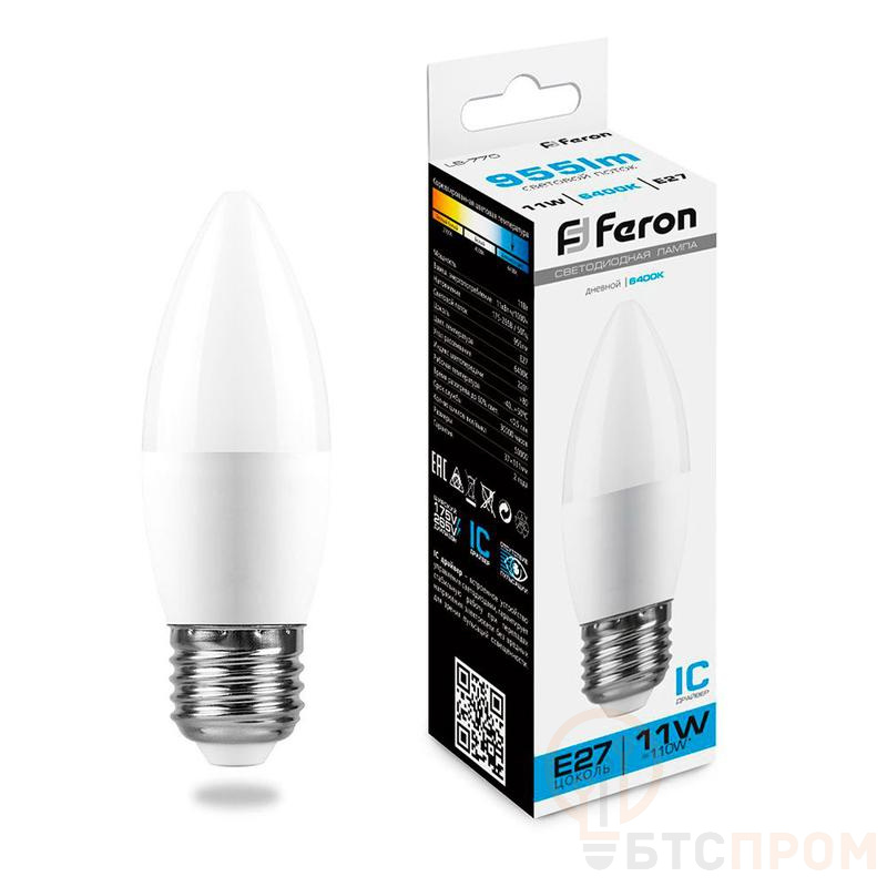 Лампа светодиодная FERON LB-770, C37 (свеча), 11W 175-265V E27 6400К (дневной), рассеиватель матовый белый, 955Lm, угол рассеивания 220°, корпус пластик, 107*37мм