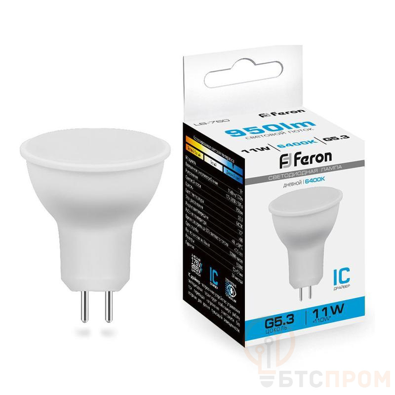 Лампа светодиодная FERON LB-760, MR16 (рефлекторная), 11W 175-265V G5.3 6400К (дневной), рассеиватель матовый белый, 950Lm, угол рассеивания 120°, 57*50мм