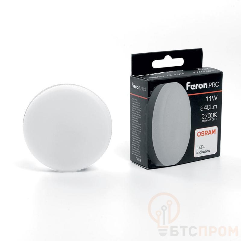 Лампа светодиодная FERON LB-1511, GX53 (таблетка), 11W 175-265V GX53 2700К (белый теплый), рассеиватель матовый белый, 840Lm, угол рассеивания 120°, 73*28мм
