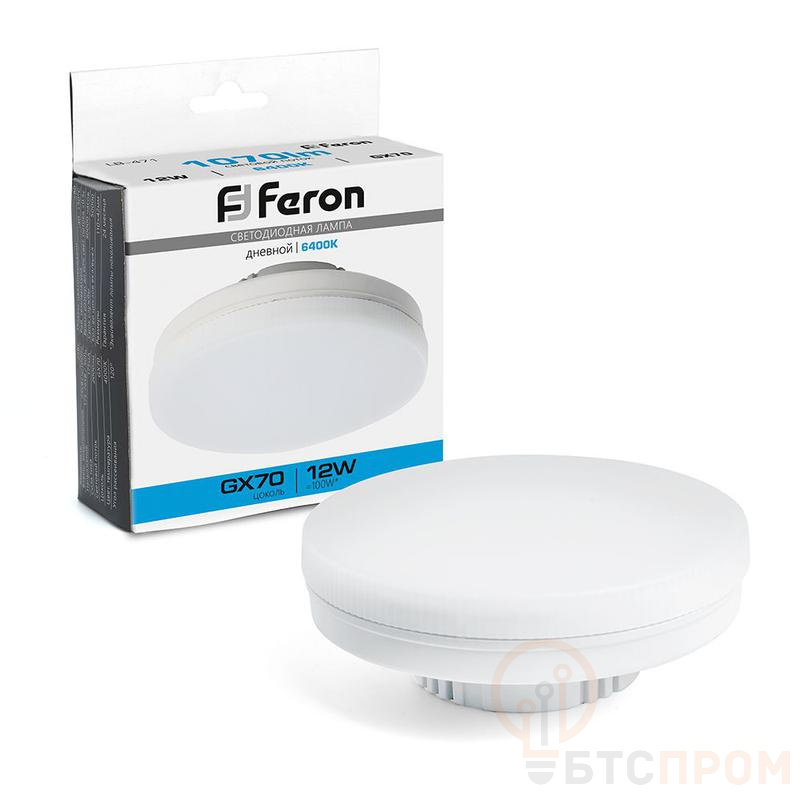 Лампа светодиодная FERON LB-471, GX70 (таблетка), 12W 175-265V GX70 6400К (дневной), рассеиватель матовый белый, 1070Lm, угол рассеивания 120°, 40*110мм