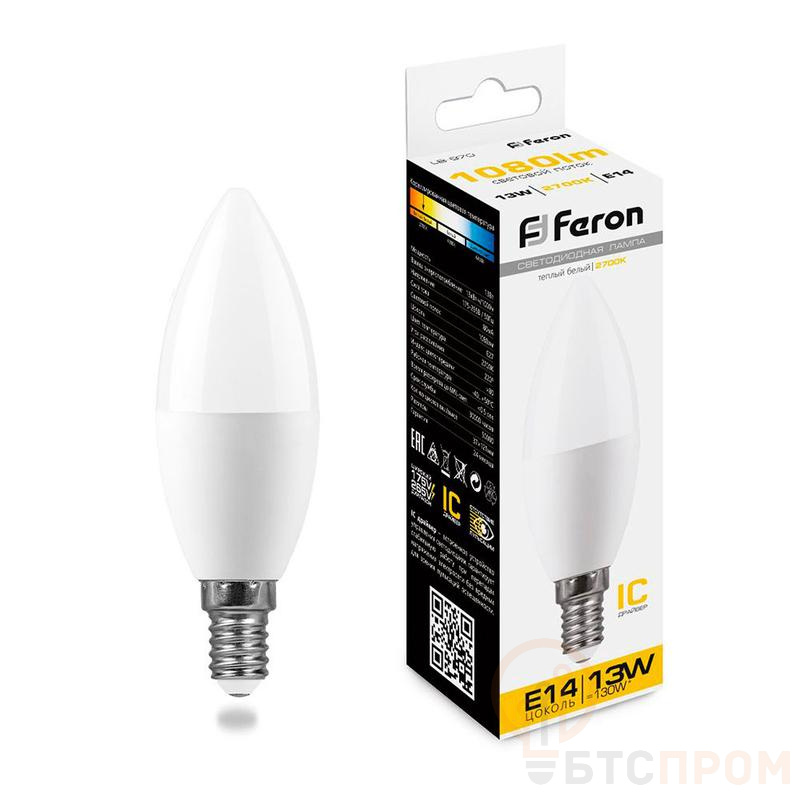 Лампа светодиодная FERON LB-970, C37 (свеча), 22W 175-265V E14 2700К (белый теплый), рассеиватель матовый белый, 1080Lm, угол рассеивания 220°, 110*37мм