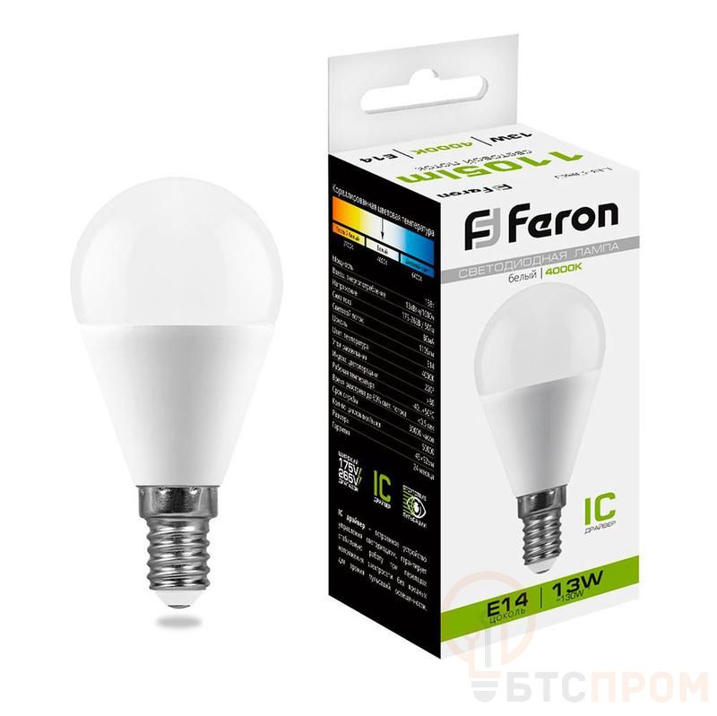 Лампа светодиодная FERON LB-950, G45 (шар малый), 13W 175-265V E14 4000К (белый), рассеиватель матовый белый, 1105Lm, угол рассеивания 220°, корпус пластик, 90*45мм