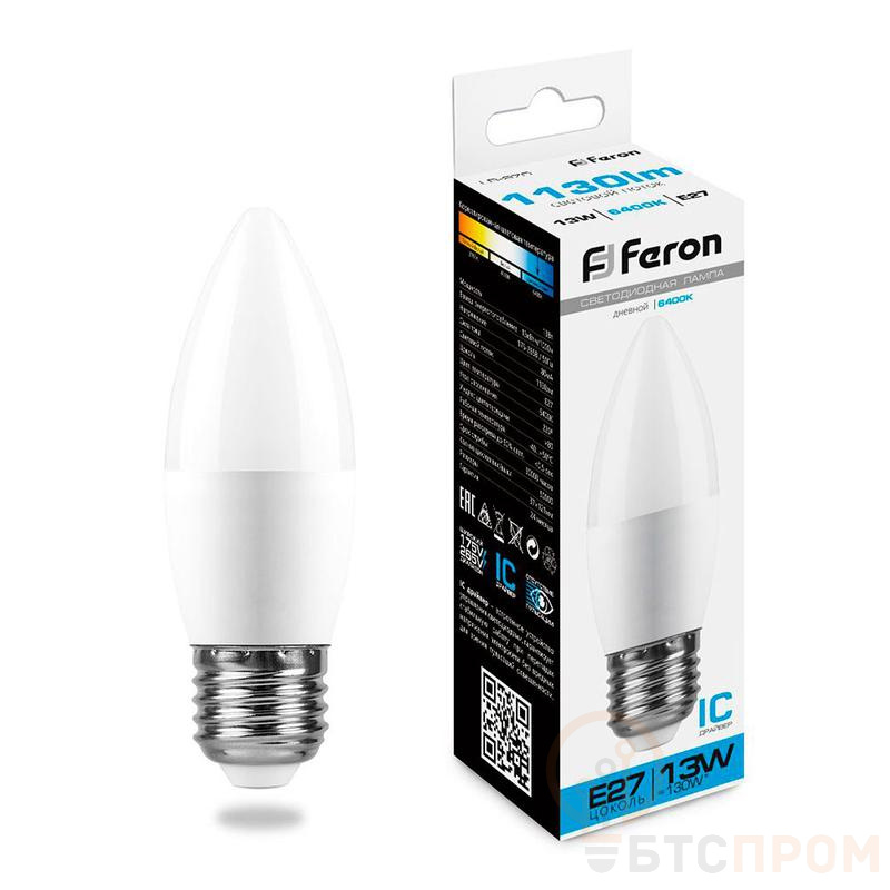 Лампа светодиодная FERON LB-970, C37 (свеча), 22W 175-265V E27 6400К (дневной), рассеиватель матовый белый, 1130Lm, угол рассеивания 220°, 107*37мм