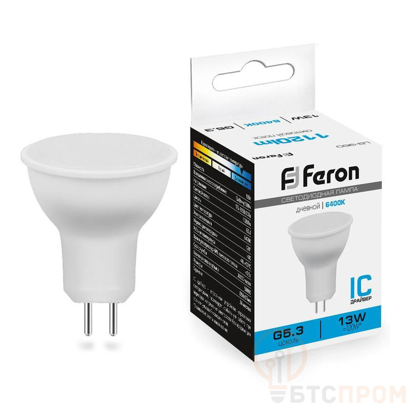 Лампа светодиодная FERON LB-960, MR16 (рефлекторная), 13W 175-265V G5.3 6400К (дневной), рассеиватель матовый белый, 1120Lm, угол рассеивания 120°, 57*50мм