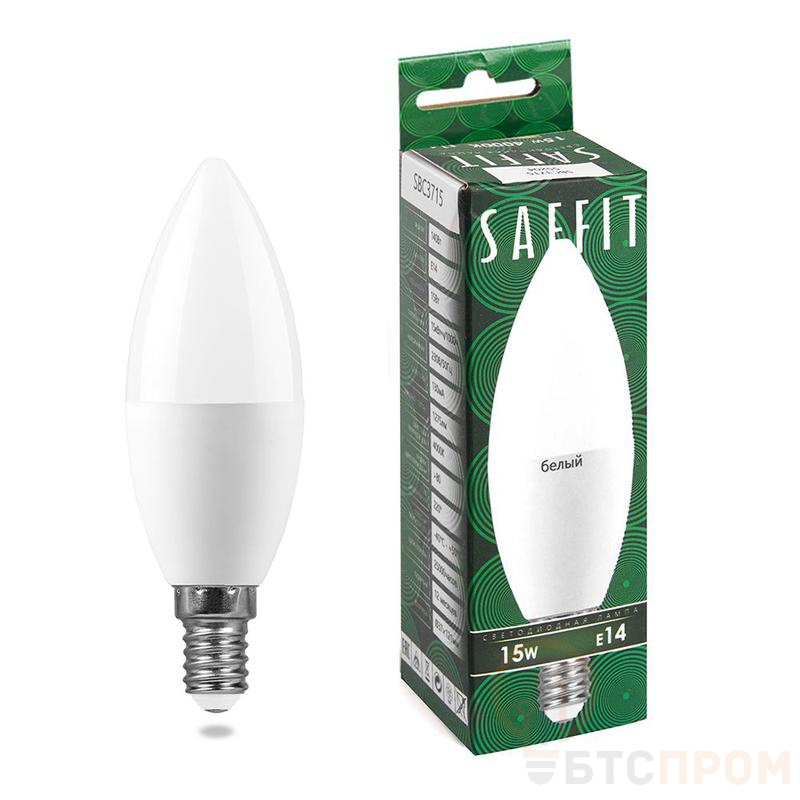Лампа светодиодная SAFFIT SBC3715, C37 (свеча), 15W 230V E14 4000К (белый), рассеиватель матовый белый, 1275Lm, угол рассеивания 220°, 110*37мм