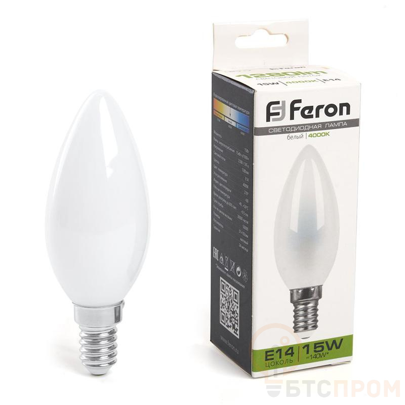 Лампа светодиодная филамент FERON LB-717, C35 (свеча), 15W 230V E14 4000К (белый), рассеиватель матовый белый, 1280Lm, угол рассеивания 270°, 100*37мм