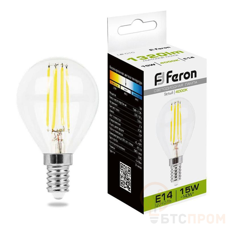 Лампа светодиодная филамент FERON LB-515, G45 (шар малый), 15W 230V E14 4000К (белый), рассеиватель прозрачный 1320Lm, угол рассеивания 270°, 80*45мм