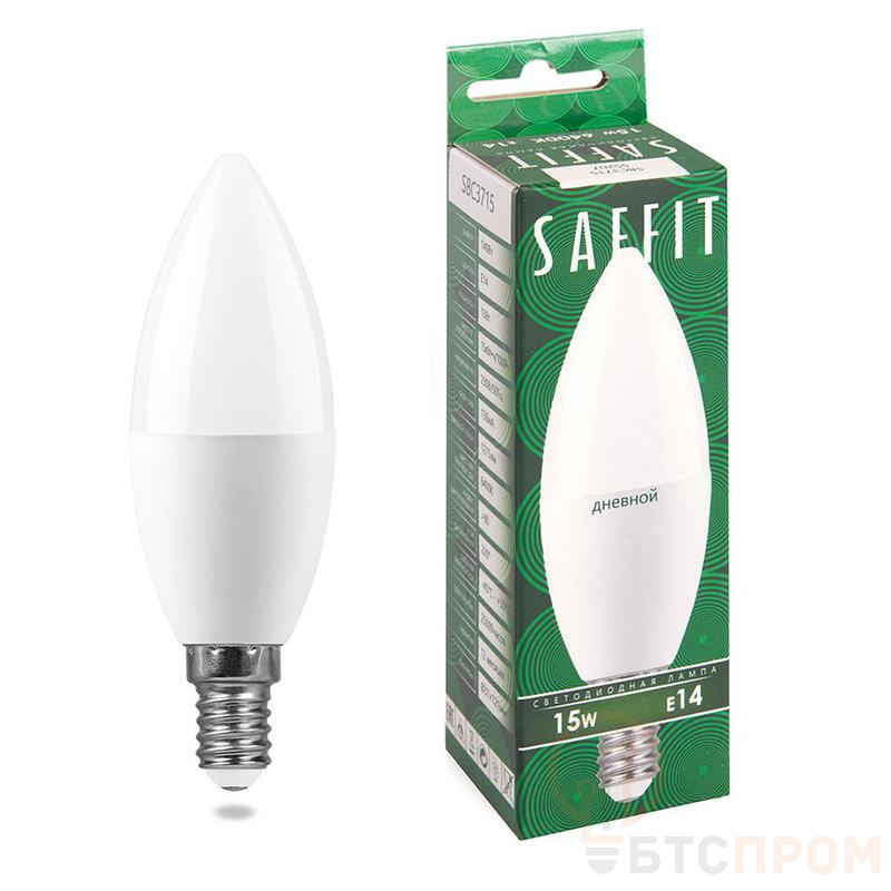 Лампа светодиодная SAFFIT SBC3715, C37 (свеча), 15W 230V E14 6400К (дневной), рассеиватель матовый белый, 1275Lm, угол рассеивания 220°, 110*37мм