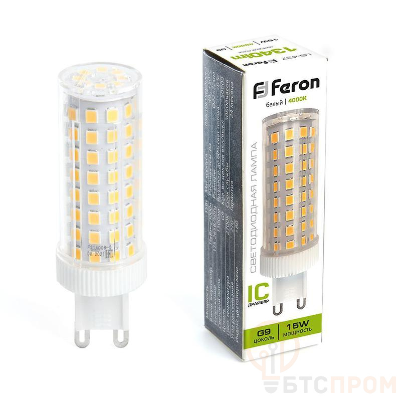 Лампа светодиодная FERON LB-437, JCD9 (капсульная), 15W 175-265V G9 4000К (белый), рассеиватель прозрачный 1340Lm, угол рассеивания 270°, 72*22мм