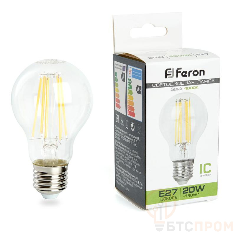 Лампа светодиодная филамент FERON LB-620, A60 (шар), 20W 175-265V E27 4000К (белый), рассеиватель прозрачный 1800Lm, угол рассеивания 270°, корпус стекло, 107*60мм