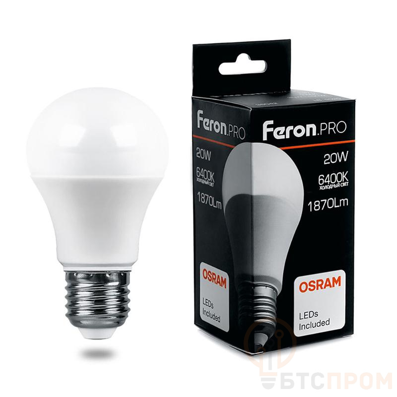 Лампа светодиодная FERON LB-1020, A65 (шар), 20W 175-265V E27 6400К (дневной), рассеиватель матовый белый, 1870Lm, угол рассеивания 220°, 134*65мм
