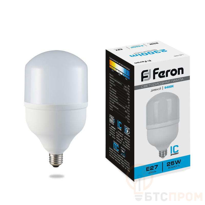 Лампа светодиодная FERON LB-65, T80 (промышленная), 25W 175-265V E27 6400К (дневной), рассеиватель матовый белый, 2300Lm, угол рассеивания 220°, корпус пластик, 135*80мм