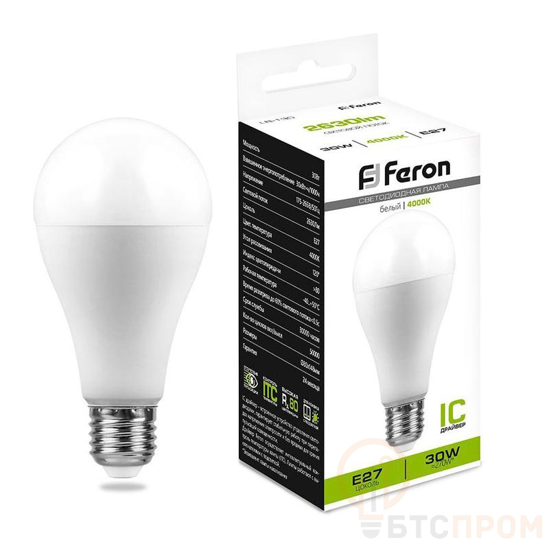 Лампа светодиодная FERON LB-130, A80 (шар), 30W 175-265V E27 4000К (белый), рассеиватель матовый белый, 2630Lm, угол рассеивания 220°, корпус пластик, 155*80мм