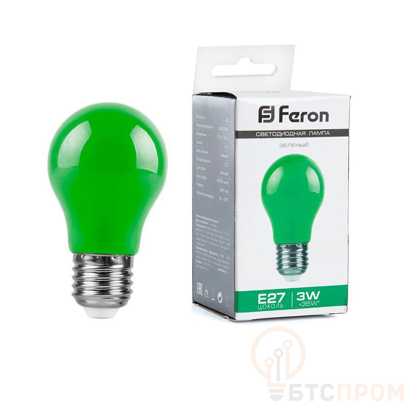 Лампа светодиодная FERON LB-375, A50 (шар), 3W 230V E27 (зеленый), рассеиватель матовый зеленый, угол рассеивания 220°, корпус пластик, 91*50мм