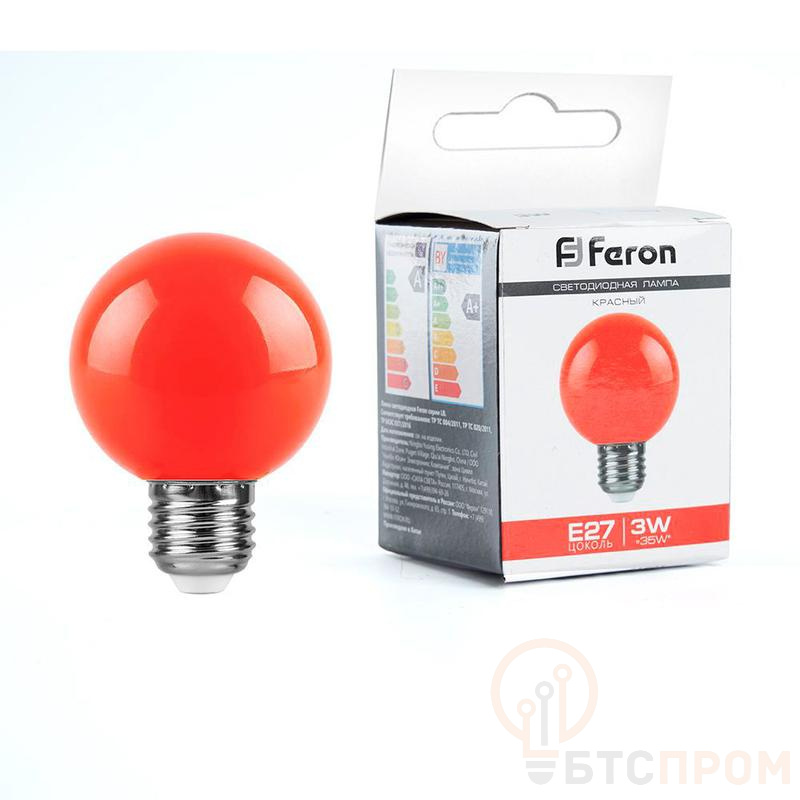 Лампа светодиодная FERON LB-371, G60 (шар), 3W 230V E27 (красный), рассеиватель матовый красный, угол рассеивания 270°, корпус пластик, 84*60мм