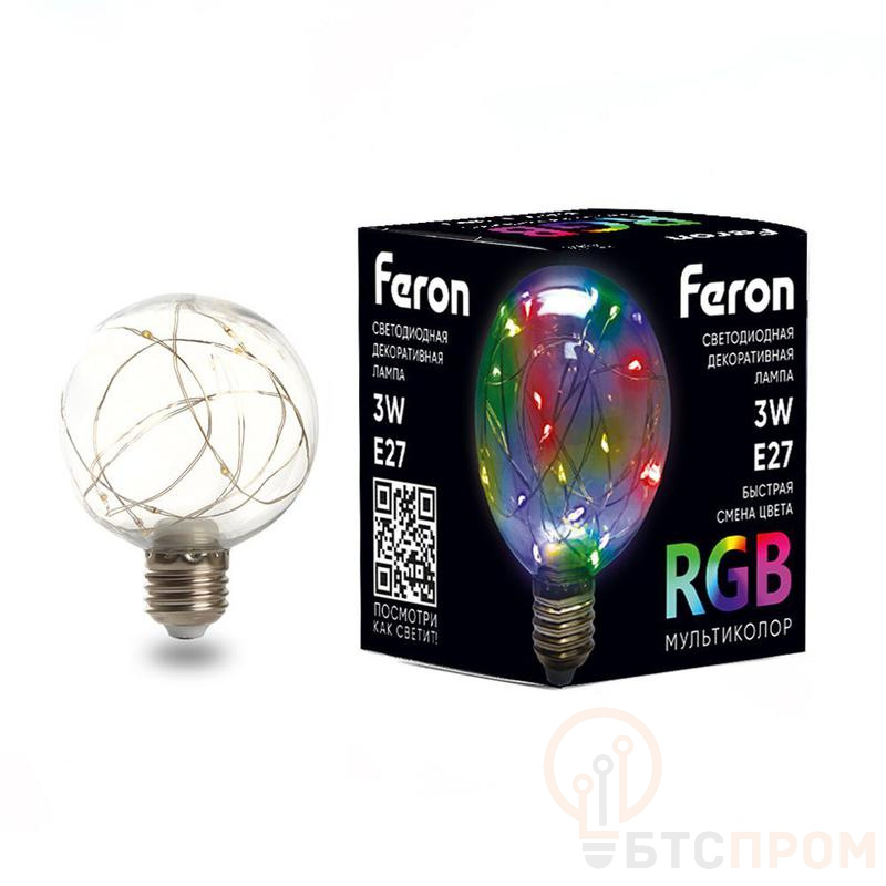 Лампа светодиодная FERON LB-381, G80, 3W 230V E27 (RGB), рассеиватель прозрачный 250Lm, угол рассеивания 220°, корпус пластик, 120*80мм