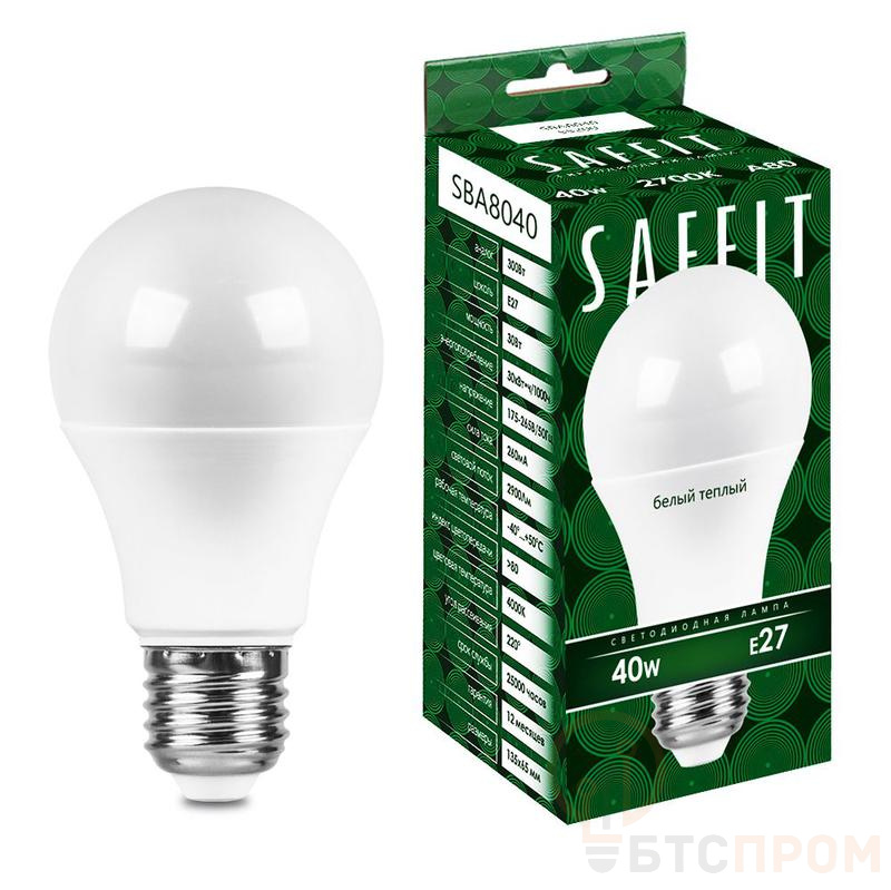 Лампа светодиодная SAFFIT SBA8040, A80 (шар), 40W 230V E27 2700К (белый теплый), рассеиватель матовый белый, 3600Lm, угол рассеивания 220°, 148*80мм