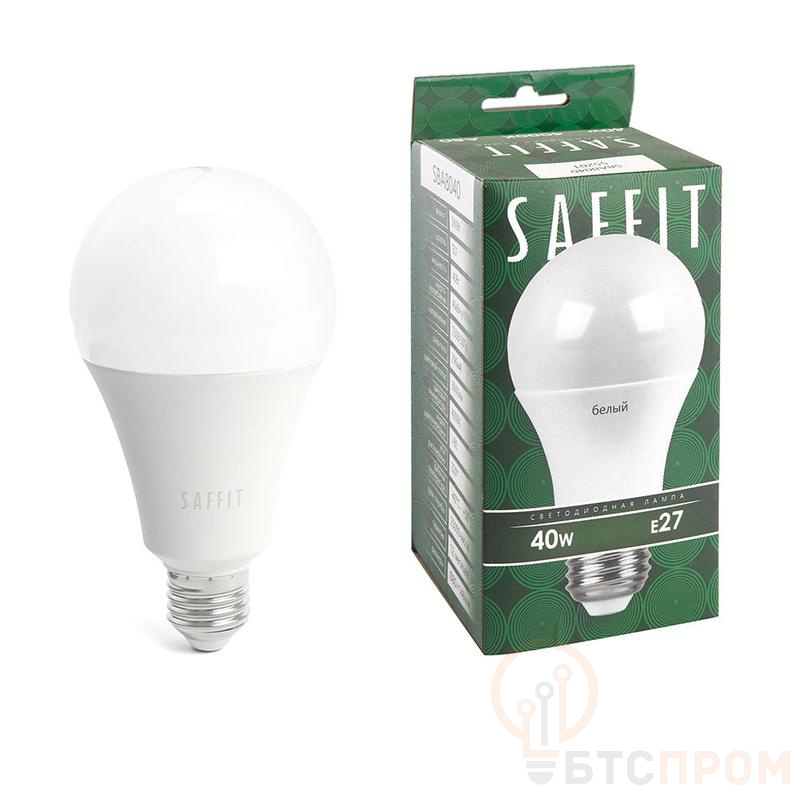 Лампа светодиодная SAFFIT SBA8040, A80 (шар), 40W 230V E27 4000К (белый), рассеиватель матовый белый, 3600Lm, угол рассеивания 220°, 148*80мм