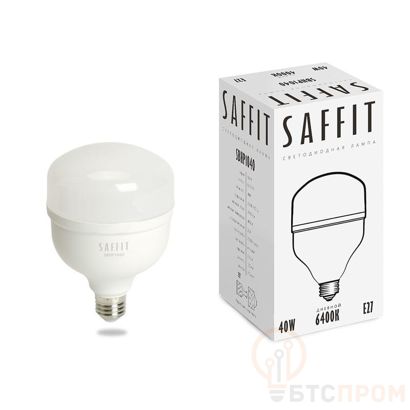 Лампа светодиодная SAFFIT SBHP1040, колба (промышленная), 40W 230V E27 6400К (дневной), рассеиватель матовый белый, 3700Lm, угол рассеивания 220°, 152*100мм