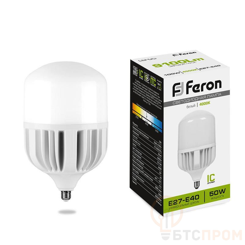 Лампа светодиодная FERON LB-65, T100 (промышленная), 50W 175-265V E27-E40 4000К (белый), рассеиватель матовый белый, 4600Lm, угол рассеивания 220°, 162*100мм