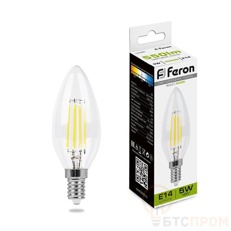 Лампа светодиодная филамент FERON LB-58, C35 (свеча), 5W 230V E14 4000К (белый), рассеиватель прозрачный 550Lm, угол рассеивания 270°, 100*35мм